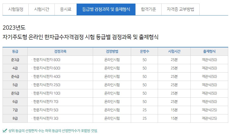 자격등급에 따라 한자의 수와 문항수, 시험시간과 출제 형식이 다릅니다.